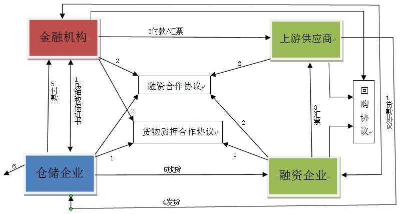2.根據(jù)融資企業(yè)所提交的購銷合同,金融機(jī)構(gòu)、融資企業(yè)與上游供貨商三方簽訂《貨物回購協(xié)議》,金融機(jī)構(gòu)、融資企業(yè)、上游供貨商和倉儲(chǔ)企業(yè)四方簽訂《融資合作協(xié)議》,融資企業(yè)向金融機(jī)構(gòu)繳納一定的保證金,金融機(jī)構(gòu)(主要指商業(yè)銀行)開出銀行承兌匯票,將銀行承兌匯票交由融資企業(yè)(此處并非一定是銀行匯票,也可以資金的形式等)。